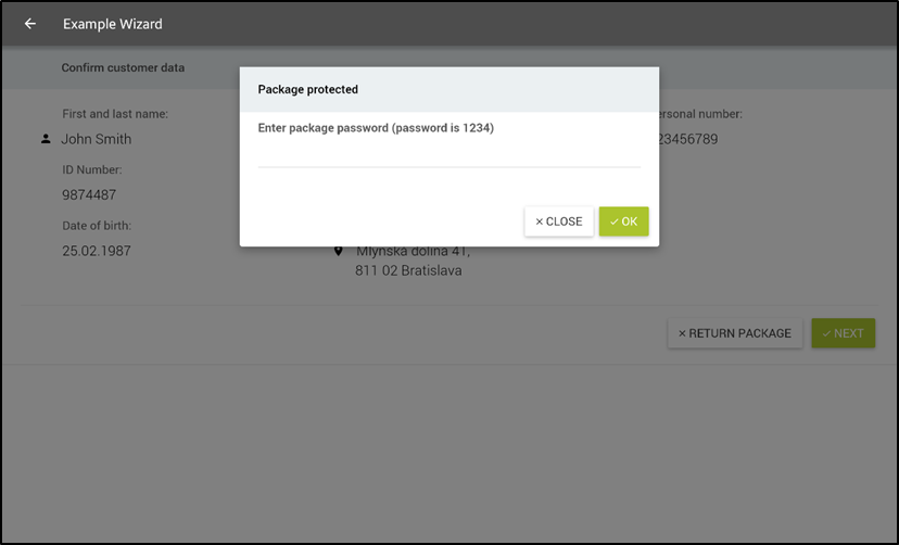 Package password has to be entered at this step. Password was sent to customer via SMS.