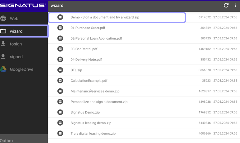 As mentioned above, a wizard is a .zip file. You can initiate it by clicking on the file in the list of documents available for signature.