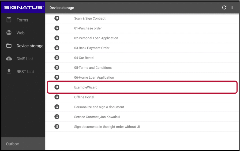 As described above, a wizard is delivered as a ZIP file. One way to start a wizard is by selecting it from the list of documents available for signing, just like opening a standard document in Signatus.