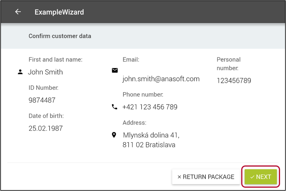 In the first step of the workflow, the wizard presents the customer’s data for review. The operator must approve the data before moving to the next step.