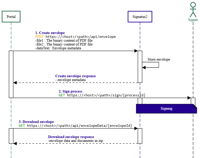 This sequence diagram illustrates the interaction between a Portal (initiating system), Signatus2, and a Signer (the end-user) during the process of creating, signing, and retrieving signed envelope.