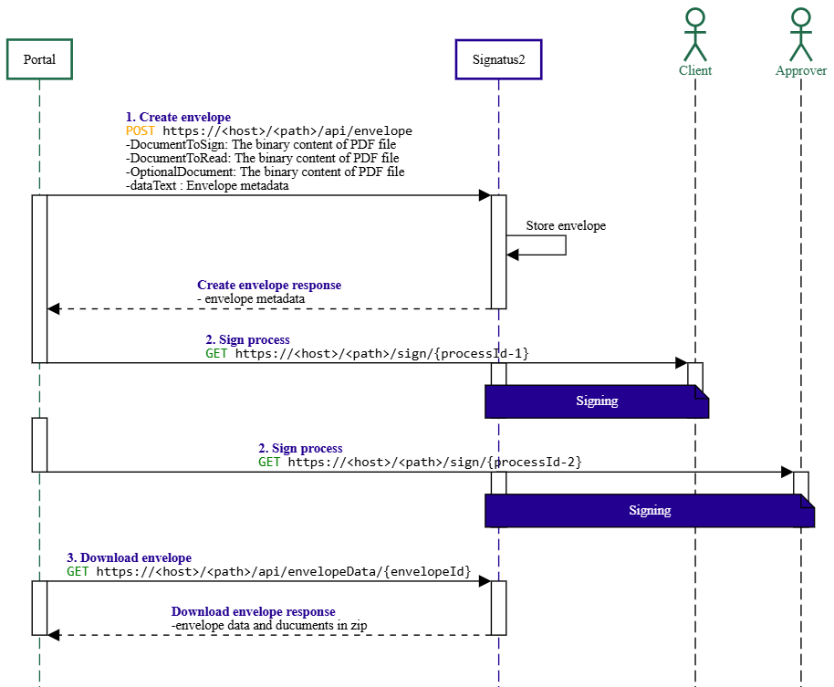 This sequence diagram illustrates the interaction between a Portal (initiating system), Signatus2, and a Signer (the end-user) during the process of creating, signing, and retrieving signed envelope.