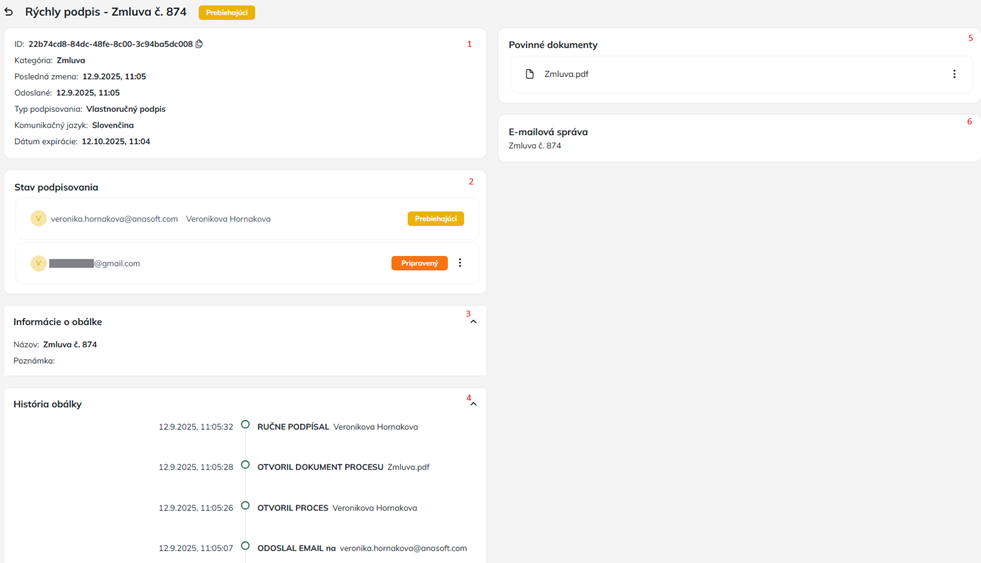 Po kliknutí na ikonu oka pri obálke sa otvorí detail. V detaile sú informácie o obálke a sekcia Stav podpisovania, ktorá obsahuje zoznam signatárov a stav každého z nich. V tejto sekcii môže používateľ obálku, ktorá je v stave Pripravený „Znova vyžiadať podpis“. Pre rýchly podpis a prípravu obálky sa tu zobrazujú e‑mailové adresy, dátumy a prehľad dokumentov. Taktiež je možné stiahnuť dokument. Detail neumožňuje meniť obsah obálky; ak sa niečo zmení, je potrebné vytvoriť novú obálku.
