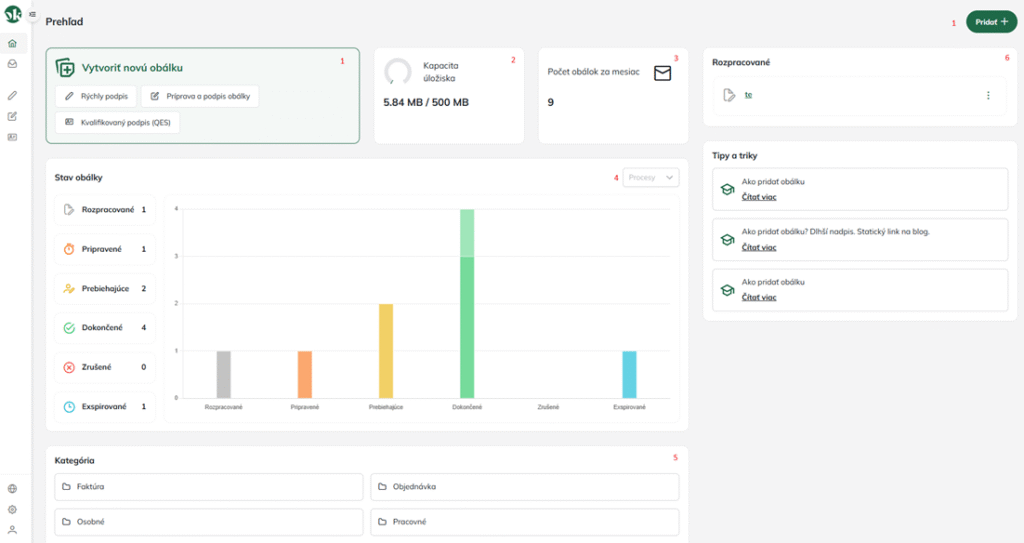 Okrem toho nájdete v sekcii Tipy a triky praktické návody a odporúčania, ktoré vám uľahčia prácu s aplikáciou. Grafické zobrazenie stavu obálok vám zase umožní na prvý pohľad zistiť, koľko dokumentov je rozpracovaných, pripravených, prebiehajúcich či dokončených.
