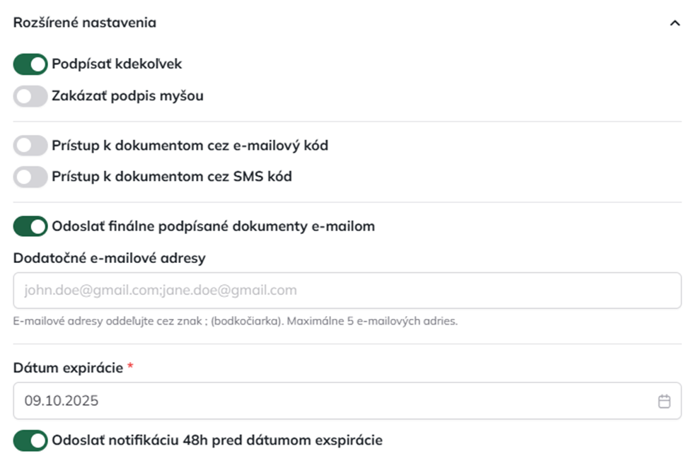 Dátum exspirácie: definuje časový limit, dokedy je obálka platná a dostupná na podpisovanie. Systém štandardne nastaví predvolenú hodnotu (mesiac od aktuálneho dátumu), ktorú však môžete manuálne upraviť podľa vašich potrieb.