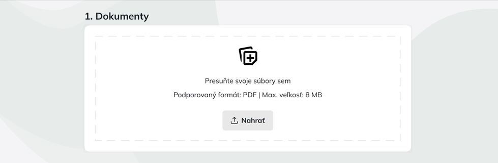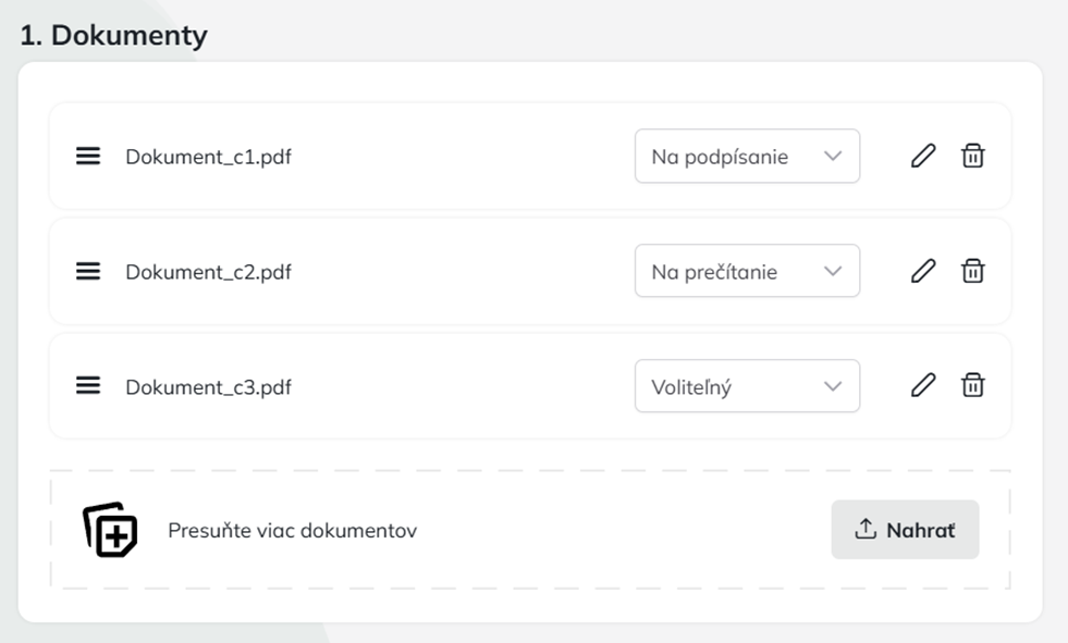 Táto sekcia je určená na správu všetkých dokumentov, ktoré tvoria súčasť podpisovej obálky. Pre intuitívnu správu je podporované pridávanie súborov pomocou funkcie drag & drop. V sekcii rovnako jednoducho môže používateľ meniť poradie dokumentov, názov dokumentu, zmazať a pridať dokument. Používateľ môže pridať 1 až 10 dokumentov vo formáte PDF (1 dokument nesmie presiahnuť 8MB, obálka nesmie presiahnuť veľkosť 20 MB), ktorým následne zadefinuje typ: