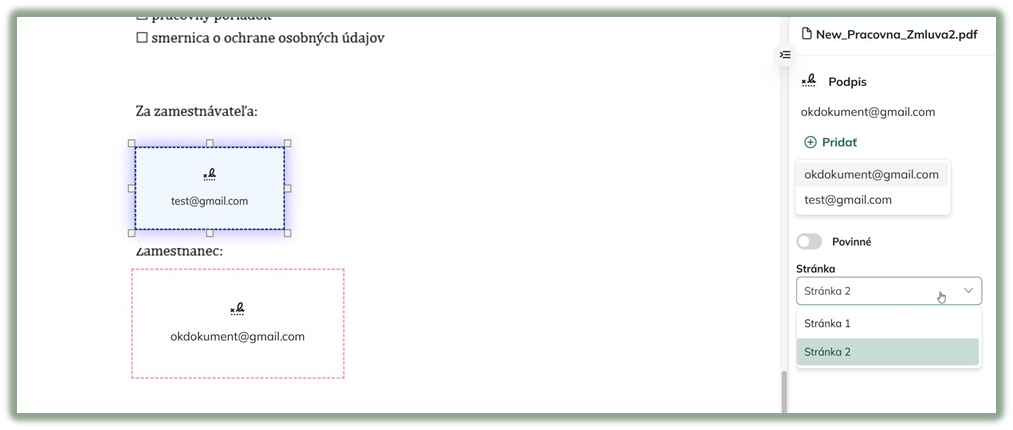 - Používateľ umiestni podpisové miesto na požadované miesto ťahaním myši. Pri každom poli môžete zvoliť, ktorý signatár sa podpisuje a či je podpis povinný.
